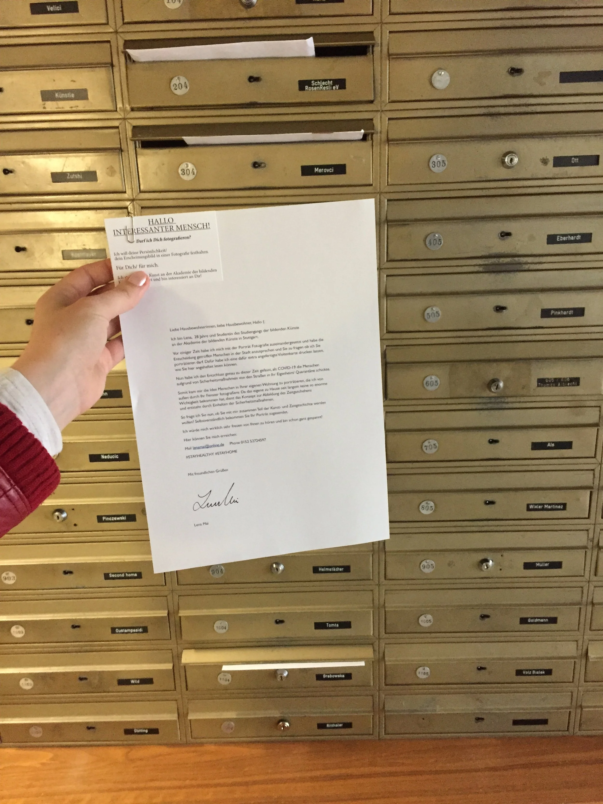 Durch eine Briefkastenaktion habe ich diverse Personen während der COVID-Pandemie erreichen können. Durch einen Brief, der mein Vorhaben schilderte, gewann ich Kontakt zu Personen, die ich durch das Einhalten eines Sicherheitsabstandes portraitieren durfte.